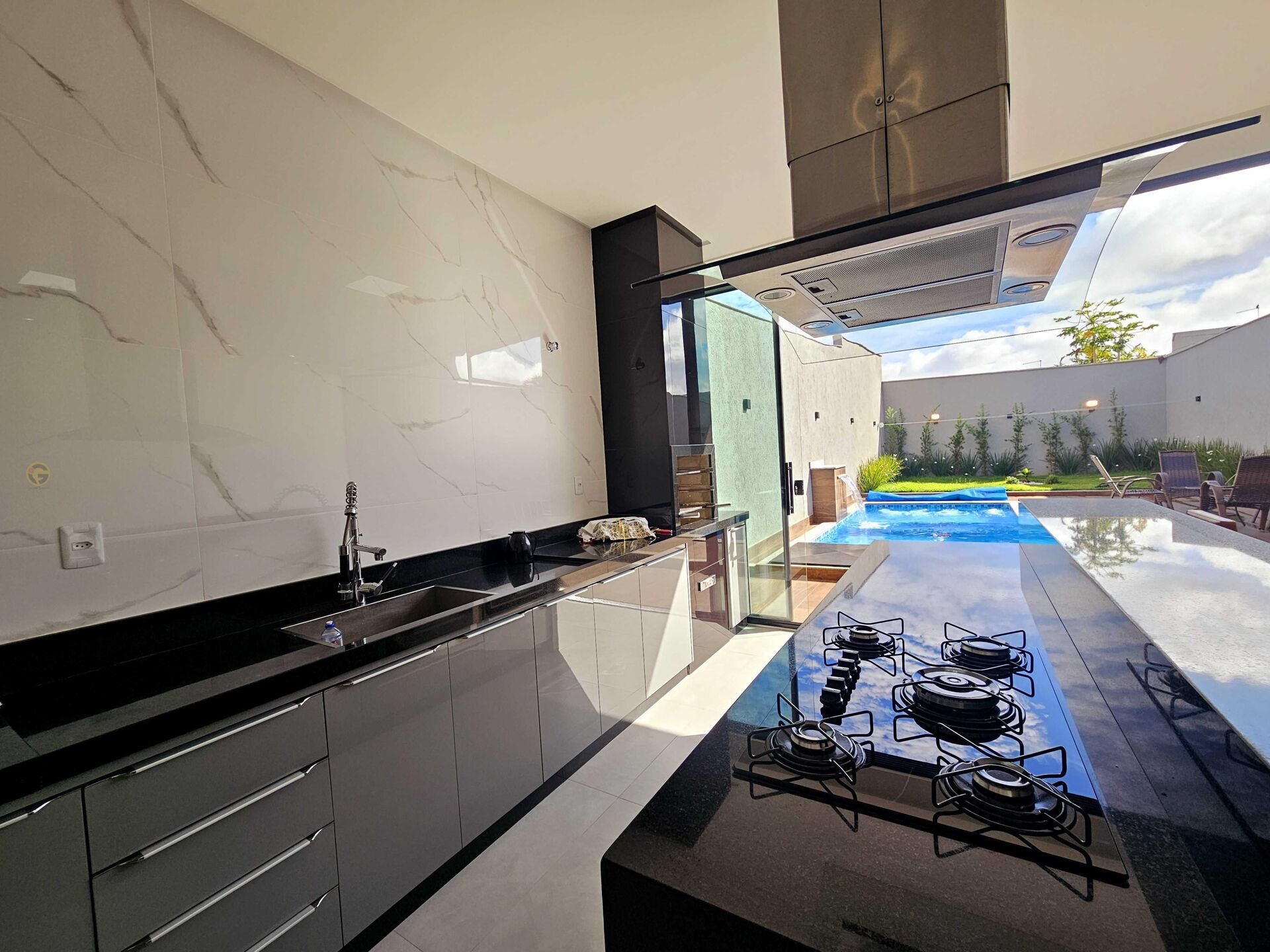 Área Gourmet completa, com ilha, cooktop e forno, ideal para churrascos e encontros.
